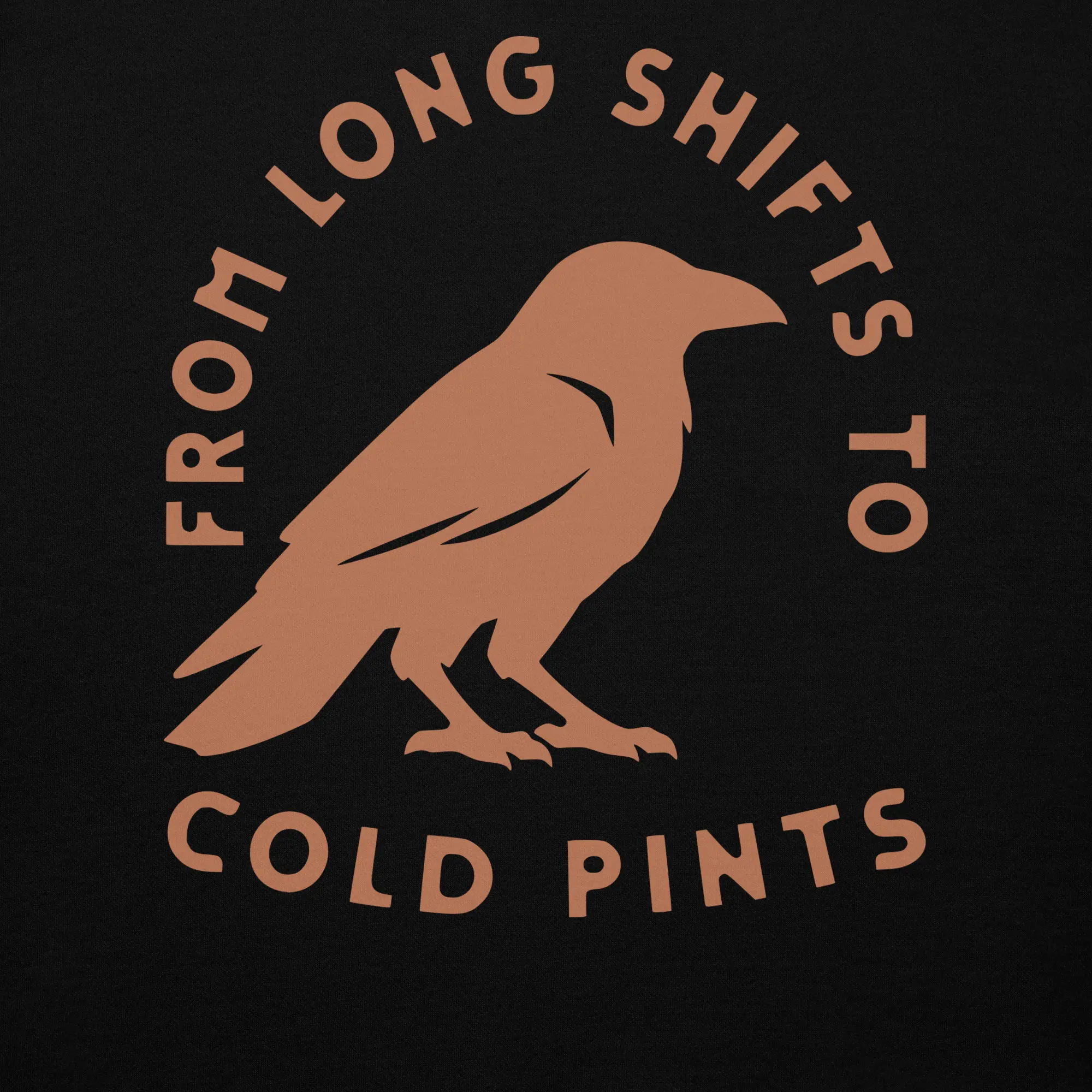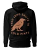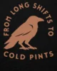 The Long Shifts hoodie carries the BLKFOG crow badge across the back — a mark for those who know the rhythm of the day: early mornings, long hours, and the cold pint waiting at the end of it.